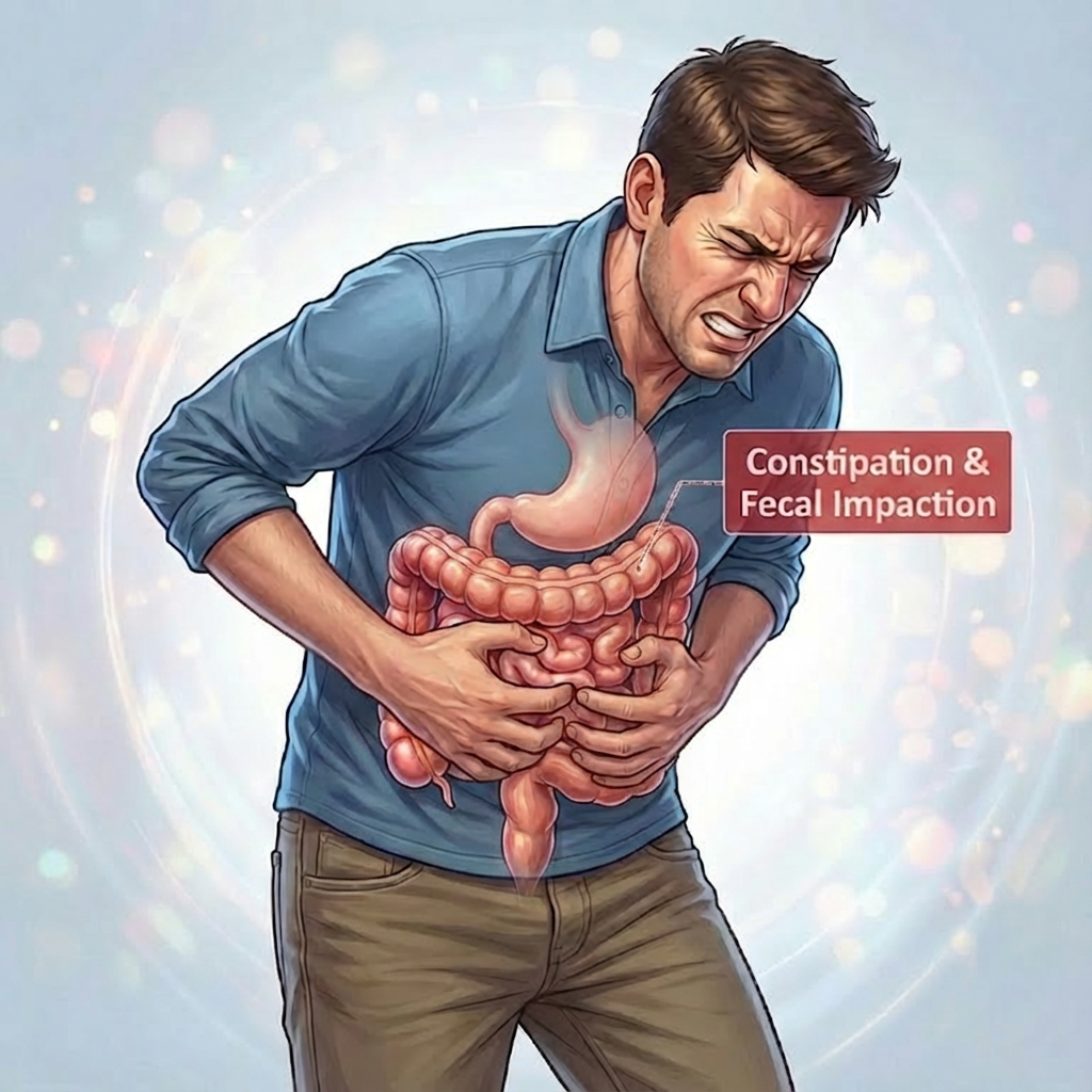 کاهش دفعات اجابت مزاج (کمتر از ۳ بار در هفته)، سفتی مدفوع،